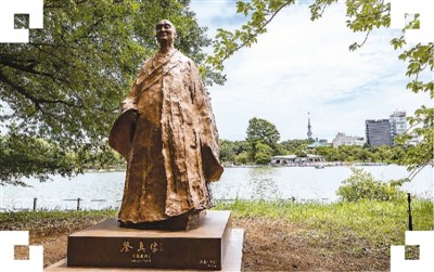 为纪念中日邦交正常化50周年,中国美术馆馆长吴为山的雕塑作品鉴真铜像近日在日本东京上野公园“不忍池”湖畔落成揭幕。图为鉴真铜像。