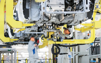 四川省宜宾市围绕绿色、低碳发展理念,将新能源汽车作为产业发展着力点。目前,“宜宾造”凯翼汽车已出口至亚洲、中南美洲、非洲的10个国家和地区。图为近日,宜宾市三江新区凯翼汽车智慧总装车间内,工人在生产线上忙碌。 |
