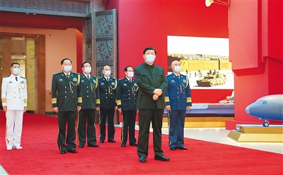 下午4时30分许,习近平来到中国人民革命军事博物馆,步入展厅参观展览。展览聚焦以习近平同志为核心的党中央领导国防和军队建设的伟大实践,安排8个单元展区,设置“党在新时代的强军目标”、“重整行装再出发”、“砺剑铸盾 奔向一流”、“大好河山 寸土不让”、“爱我人民爱我军”、“深情励三军 奋进新征程”等重点展项,通过1400余件文物实物、630余张照片、近百套武器装备模型以及大量图表、视频、艺术作品、互动项目等,生动展示了新时代国防和军队建设的壮阔历程和伟大成就,充分展现了人民军队忠诚维护核心、矢志奋斗强军的昂扬风貌。习近平不时驻足观看,认真听取讲解,询问有关情况。