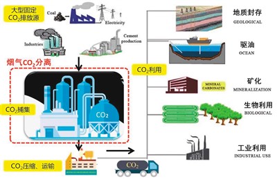 二氧化碳捕集、利用与封存过程示意图。 |
