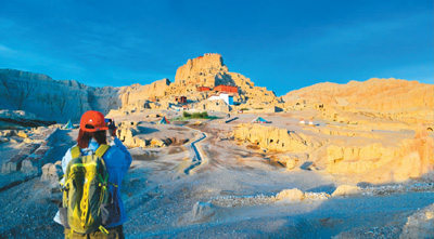 近日,位于西藏自治区阿里地区札达县的扎达土林、古格王国遗址等地质、人文景观吸引游客到访游玩。图为8月3日,游客在札达县拍摄古格王国遗址。