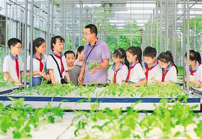 暑假期间,安徽省黄山市歙县郑村镇乡村少年宫持续开展多场次“学农、知农、爱农”暑期社会实践活动,带领小朋友学习现代农业科技知识,了解农事。 图为8月2日,歙县郑村镇“四月乡村”现代农业产业园农技人员为孩子们讲解太空育种及无土栽培技术。 郑 宏摄(人民图片)