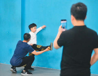 6岁的华华是一名川剧爱好者。2020年起,他的父亲周正华在短视频平台开设账号“川剧男孩华华”,分享儿子学习川剧的过程,让更多人了解传统文化。图为华华在练习基本功,周正华在一旁拍摄。 |