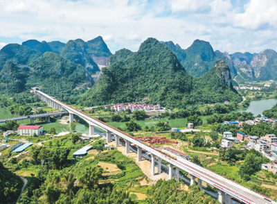 8月16日,广西壮族自治区河池市,一台铺轨机将一段500米长钢轨铺设在贵(阳)南(宁)高铁龙江双线特大桥的无砟道床上,标志着贵南高铁正式进入铺轨阶段。贵南高铁设计时速350公里,全线预计2023年底开通运营,届时贵阳至南宁通行时间将缩短至2小时左右。