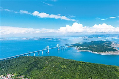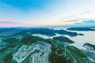 近日,福建省福州市平潭岛北部湾,风机矗立在山巅和大海中,在夕阳余晖的照映下,构成一幅美丽的画卷。