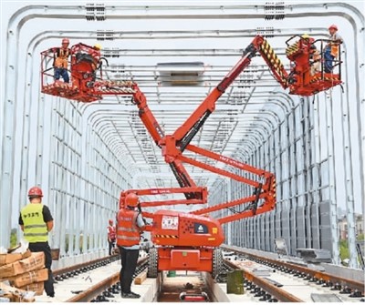 中秋假期,铁路建设者坚守岗位,推进建设,确保进度。图为在安徽省滁州市南谯区腰铺镇,建设者们在滁(滁州)宁(南京)城际铁路二期高架线上安装环保声屏障。 |