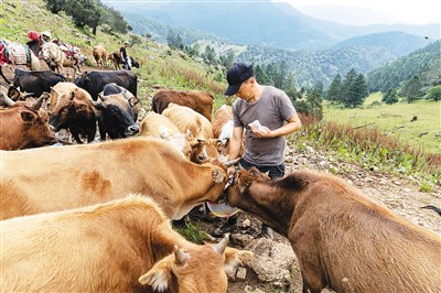 泸沽湖马帮队队员郭高左在上山途中给散养在山中的自家牲口喂盐巴。 |