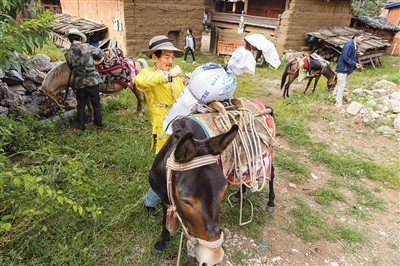 在盐源县泸沽湖镇木垮村,泸沽湖马帮队队员打包行李准备出发上山。 |