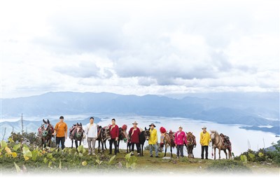 泸沽湖马帮队队员们在牛窝子山山顶观景台合影。 |