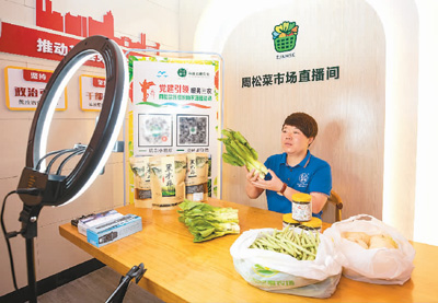 一名主播在浙江省瑞安市玉海街道周松菜市场网络直播间销售农产品。 |