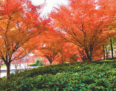 海门的秋天是那么明艳。清凉的秋风把天空刷得愈加湛蓝,白云不断演绎着神奇,卷云、鳞云、积云变幻莫测。黄的、红的、绿的树叶给小城穿上了华裳。泛黄的叶子在飒飒秋风中摇摇欲坠,有的在树枝上荡着秋千,有的陆续飘落下来,还有的打着旋儿落入水中;遍地的菊花盛开,仰望着“霜叶红于二月花”的枫叶,见证着秋天的浓墨重彩。农业生态园里粉红的蟠桃、火红的石榴、橙黄的柿子和紫色绿色的葡萄等水果令人目不暇接。