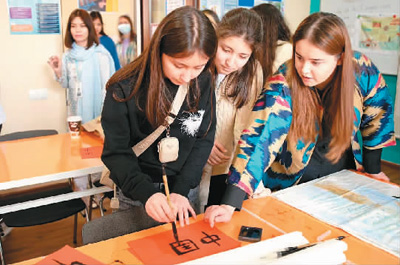 三月二十六日,塔什干孔子学院的学生学写毛笔字。 |