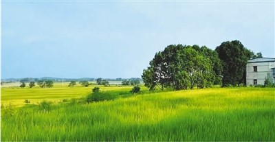 这片稻田位于安徽省桐城市孔城镇铁山村。放眼望去,除了远处的山,近处也是一帧精巧布局的画面——左边是一个被绿荫掩映几乎看不见人家的村庄,右边是一栋别致的农家小楼,两排如蘑菇状的绿树夹在小楼与稻田之间。阡陌纵横,色彩斑斓,仿佛神仙遗落凡间的画板,让人一下子联想起电视里看到的农场风光。