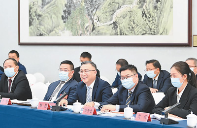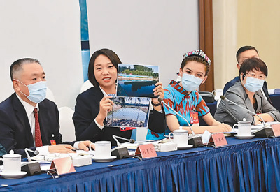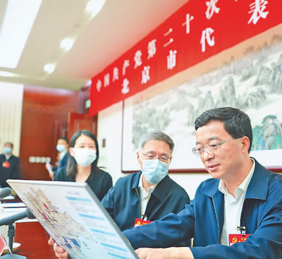 10月17日,在北京代表团举行的分组会议上,北京市大兴区委书记王有国代表(右一)精心准备图板,展示近年来在大兴区首次出现的震旦鸦雀等珍稀鸟类,反映出北京的生物多样性保护取得显著成效。 本报记者 贺 勇摄