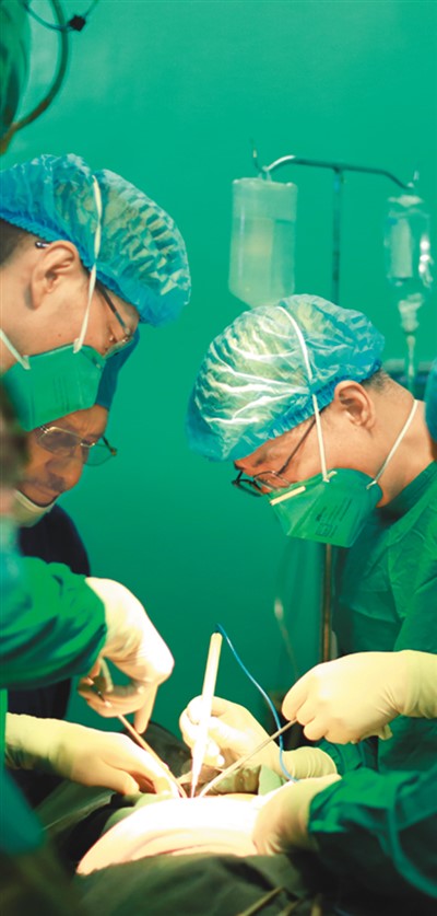 在苏丹喀土穆恩图曼友谊医院,中国医疗队队员与当地医务人员为患者实施手术。 |