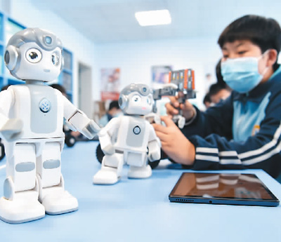 河北省石家庄市积极打造特色人工智能教育品牌,在当地多所中小学校开设人工智能课程,学生通过参加人工智能社团活动,进一步学习机器人编程等课程。图为河北省石家庄市井陉县秀林镇中学内,学生在进行人工智能设备安装调试。