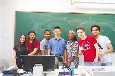 洪桐怀(左四)在北京语言大学的教室中和来华留学生合影。 |
