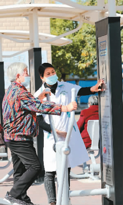 图为10月18日,山东省东营市东营区文汇街道胜安社区智能健身广场,81岁的杨学英(左)跟医护人员学习使用智能健身器材。 |