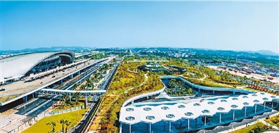广西壮族自治区南宁国际空港综合交通枢纽工程日前正式竣工投运。该项目由中建八局南方公司承建,是广西首个集民航、高铁、地铁、城市公交及公路等功能为一体的特大型现代综合交通枢纽。项目建成后,崇左市与吴圩机场之间的路程将缩短至30分钟。图为南宁国际空港综合交通枢纽工程。