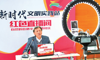 10月28日,河北省秦皇岛市海港区白塔岭街道半岛书香社区党员付东平在社区“红色直播间”,用网络直播的方式宣讲党的二十大精神。 |