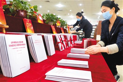 10月31日,安徽省六安市新华书店工作人员在整理新上架的《高举中国特色社会主义伟大旗帜 为全面建设社会主义现代化国家而团结奋斗》单行本,供市民选购。 |