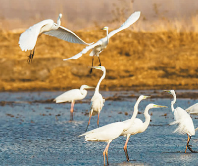 白鹭在湖畔湿地起舞。 |