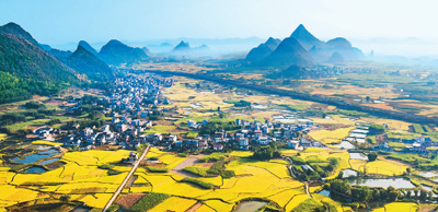 近日,广西壮族自治区柳州市柳城县境内的15万亩晚稻进入成熟期,金黄的稻田与群山、道路、村落构成秀美的田园画卷。图为在柳城县太平镇杨梅村拍摄的田园风光。