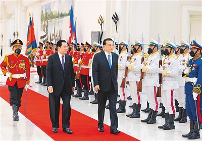 会谈前,洪森在和平大厦为李克强举行隆重欢迎仪式。两国总理登上检阅台,军乐队高奏中柬两国国歌。李克强在洪森陪同下检阅了仪仗队。