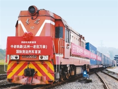 十一月十六日,西部陆海新通道中老铁路(达州—老挝万象)国际货运列车首发。图为当日列车驶出四川达州高新区瓮福集装箱货场,开往老挝万象。
