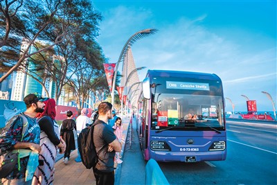 卡塔尔市民在等候乘坐宇通新能源客车。 |