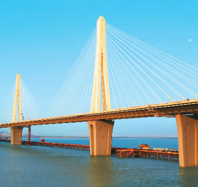 金海特大桥是珠三角入海口上建设的第一座公铁两用大桥,也是世界上最宽的公铁两用斜拉桥。其主桥为挑臂式钢箱梁多塔公铁同层斜拉桥,桥宽49.6米,中间通行双线时速160千米城际铁路,左右两侧通行六车道时速100千米高速公路。
