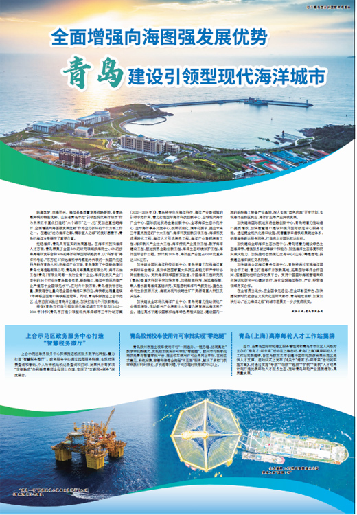 经略海洋,青岛具有坚实的发展基础。在海洋科技和海洋人才方面,青岛聚集了全国30%的研究领域涉海院士、40%的涉海高端研发平台和50%的海洋领域国际领跑技术,以“科学号”海洋科考船、“东方红3”深远海科学考察船为代表的一批国内先进科考船在青岛入列;在海洋产业方面,青岛集聚了中国船舶集团青岛北海造船有限公司、青岛明月海藻集团有限公司、海洋石油工程(青岛)有限公司等一批行业骨干企业,海洋及相关产业门类中的34个行业在青岛都有布局,船舶海工、海洋生物医药等产业产值居于全国领先水平;在对外开放方面,青岛港货物吞吐量、集装箱吞吐量均居全国沿海港口第四位,海铁联运箱量连续7年蝉联全国港口海铁联运冠军。同时,青岛积极推进上合示范区、山东自贸试验区青岛片区建设,加快打造对外开放新高地。