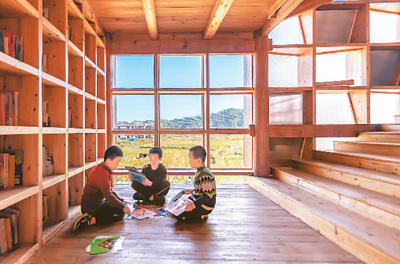 据介绍,坪坦书屋位于湖南省怀化市通道侗族自治县坪坦乡侗族村一所有400多名学童的小学庭院内,于2021年底启用。这栋建筑物楼高3层,面积约180平方米,完全以木材建造。书屋继承了传统侗族建筑的特色,由两个交错的螺旋楼梯组成,采用瓦片坡屋顶和榫卯相扣的柱梁木结构系统,既可让孩子们阅读,也可让他们玩耍和探索。