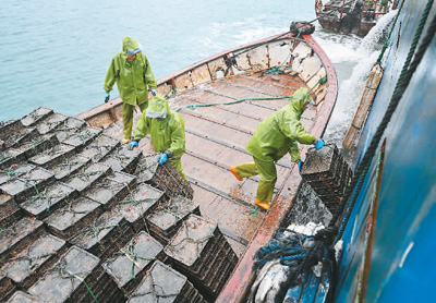 近年来,福州市连江县养殖户拓展养殖空间,采取了“南鲍北养”的养殖方式,鲍鱼生长速度更快,品质也得到提高。图为11月25日,连江县苔菉镇后湾海域热闹非凡,5万多笼鲍鱼从山东荣成乘船归来。 |