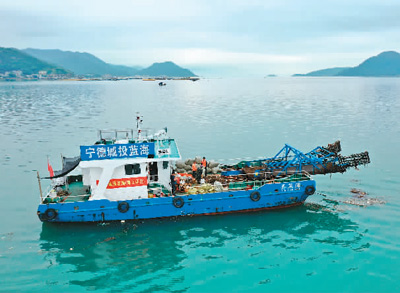 近年来,福建统筹推进从严管海、科学治海、系统护海,在更高起点上追求百姓富、生态美的和谐并进。图为机械化打捞船在宁德市三都澳海域清理海漂垃圾。 |