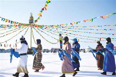 12月28日,吉林冬捕经济带启动暨查干湖第二十一届冬捕节在吉林省松原市开幕。查干湖大部分位于吉林省松原市境内,是我国知名淡水湖之一。这里渔产资源丰富,迄今保留着北方少数民族最原始的捕鱼方式。近年来,查干湖冬捕成为当地旅游的金名片。图为查干湖第二十一届冬捕节祭湖醒网仪式现场。
