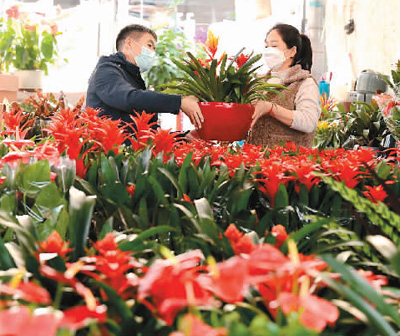 新年临近,各地花卉市场繁忙起来。图为12月27日,河北省石家庄市市民在一家市场选购花卉。 陈其保摄(新华社发)