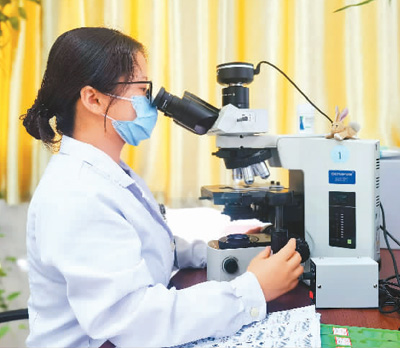 图为淳安县第一人民医院病理科党员医务工作者正在为肿瘤患者进行显微病理分析。
