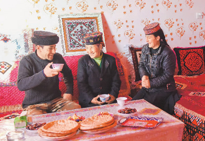 在塔什库尔干塔吉克自治县塔提库力易地扶贫搬迁安置点,村民在家中休息聊天。 |