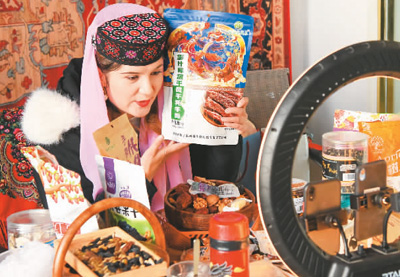 在塔什库尔干塔吉克自治县电子商务公共服务中心,一名塔吉克族主播通过网络直播推销当地特产。 |