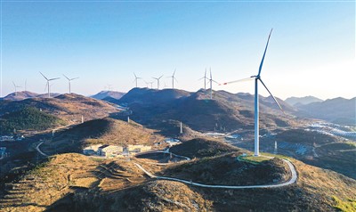 近年来,贵州省铜仁市松桃苗族自治县践行“绿水青山就是金山银山”的理念,利用荒山荒坡丰富的风力和光能发电,每年可提供10600万千瓦时电量并入南方电网,推动能源结构优化,服务乡村振兴,助力碳达峰碳中和目标实现。图为松桃苗族自治县盘石镇风力和光伏发电场。