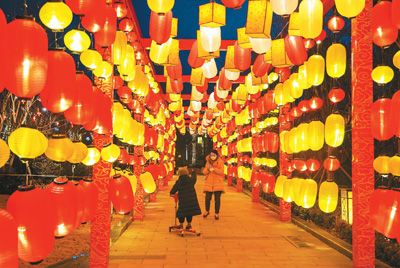 春节临近,山东省临沂市银雀山兵学文化公园张灯结彩,夜晚灯光璀璨。 |