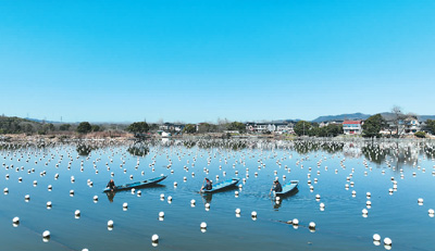 春节假期过后,浙江省湖州市德清县的珍珠养殖户抢抓农时,对珍珠蚌进行管护,水面上呈现出一派“春耕”的忙碌景象。图为1月31日,德清县洛舍镇的小山漾珍珠生态养殖基地,珍珠养殖户在对珍珠蚌进行管护。