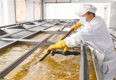 近日,陕西延安甘泉县一家食品公司工作人员在车间浸泡大豆。 |
