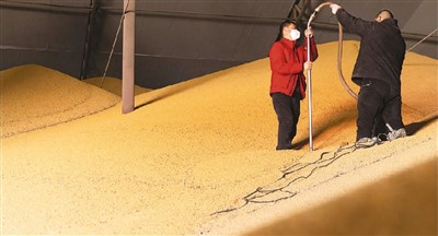 在绥化市益盛粮食购销有限公司内,工人进行扦样作业,以此了解储存仓内大豆水分、杂质以及虫害等情况。 |
