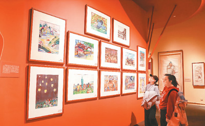 观众在观看展出的海峡两岸少儿美术作品。