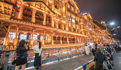 游客在重庆市洪崖洞街区夜游拍照。 |