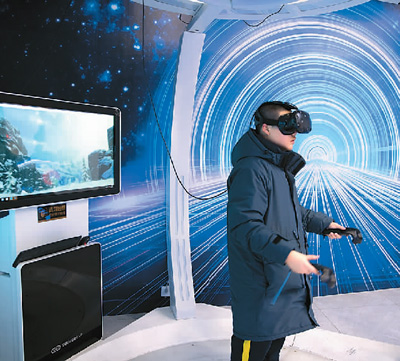 哈尔滨冰雪大世界园区内的冰雪元宇宙体验中心日前成为热门“打卡”地。游客在这里可以一站式体验冰雪沉浸式互动娱乐、VR社交项目等,实现从“看冰雪”到“玩冰雪”,从“冬季冰雪”到“四季冰雪”,助推冰雪经济新业态。图为游客在冰雪元宇宙体验中心体验虚拟现实(VR)滑雪。