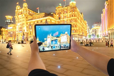 市民在上海外滩体验基于元宇宙概念的城市数字孪生应用程序。 |