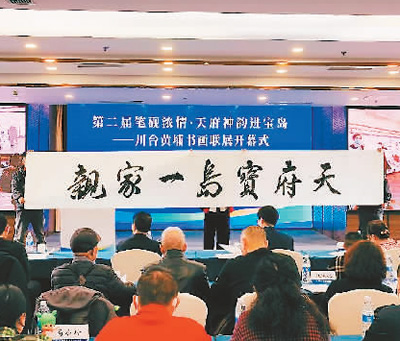 在开幕式成都会场,与会嘉宾展示“天府宝岛一家亲”书法作品。 |
